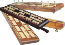 13" Flat Inlaid Cribbage Boards with brass pedestals in Golden Rosewood, Rosewood, Ebony, White Maple & Brass Inlaid
