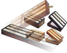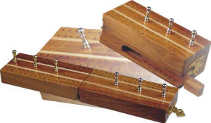 10" Flat Inlaid Cribbage Boards with brass pedestals in Golden Rosewood, Rosewood, Ebony, White Maple & Brass Inlaid